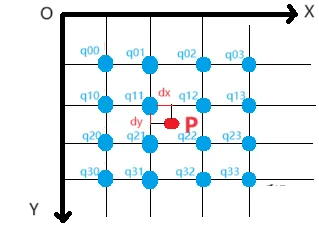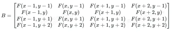 对这个浮点数坐标取整,则x = floor(fx),y = floor(fy),水平方向权重系数dx = fx - x,垂直方向权重系数dy = fy - y;那么参考的16个点坐标分别为q00 = (x-1, y-1)、q01 = (x, y-1)、q02 = (x+1, y-1) 、 q03 = (x+2, y-1)、q10 = (x-1, y)、q11 = (x, y)、q12 = (x+1, y) 、 q13 = (x+2, y)、q20 = (x-1, y+1)、q21 = (x, y+1)、q22 = (x+1, y+1) 、 q23 = (x+2, y+1)、q30 = (x-1, y+2)、q31 = (x, y+2)、q32 = (x+1, y+2) 、 q33 = (x+2, y+2)。