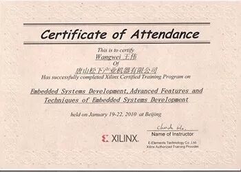 七、证 书培训结束,理论、实践双项考核成绩合格者,颁发Xilinx官方授权培训FPGA工程师证书。