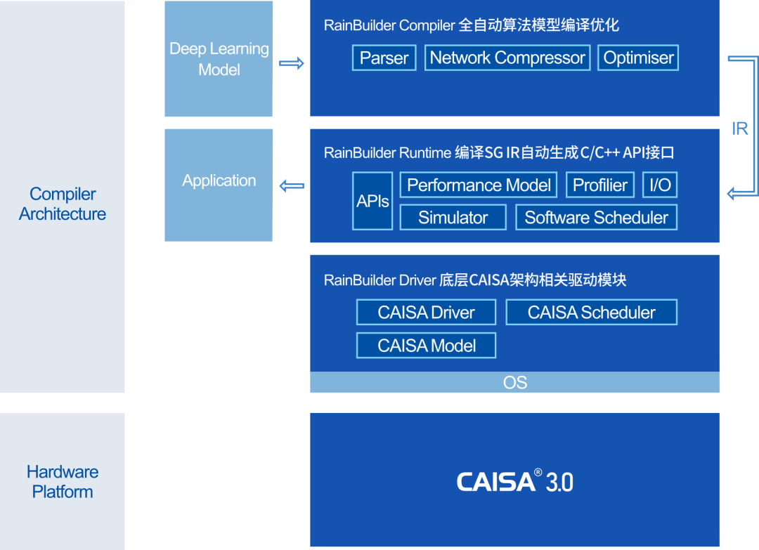 RainBuilder架构图专为CAISA3.0架构配备的RainBuilder编译工具链支持从算法到芯片的端到端自动化部署,用户和开发者无需了解架构的底层硬件配置,简单两步即可实现算法快速迁移和部署。RainBuilder编译器可自动提取主流AI开发框架(TensorFlow,Caffe,PyTorch,ONNX等)中开发的深度学习算法的网络结构和参数信息,并面向CAISA结构进行优化;工具链中的运行时(Runtime)和驱动(Driver)模块负责硬件管理并为用户提供标准的ATPI接口,运行时可以基于精确的CAISA性能模型,实现算法向CAISA架构的自动化映射,同时提供可以被高级语言直接调用的API接口;最底层的驱动可以实现对用户透明的硬件控制。RainBuilder工具链使用简单,部署方便,通用性强,可以让用户快速和低成本的部署和迁移已有算法到CAISA硬件平台上。 I 首款量产数据流AI芯片,CAISA带来AI芯片研发新方向
