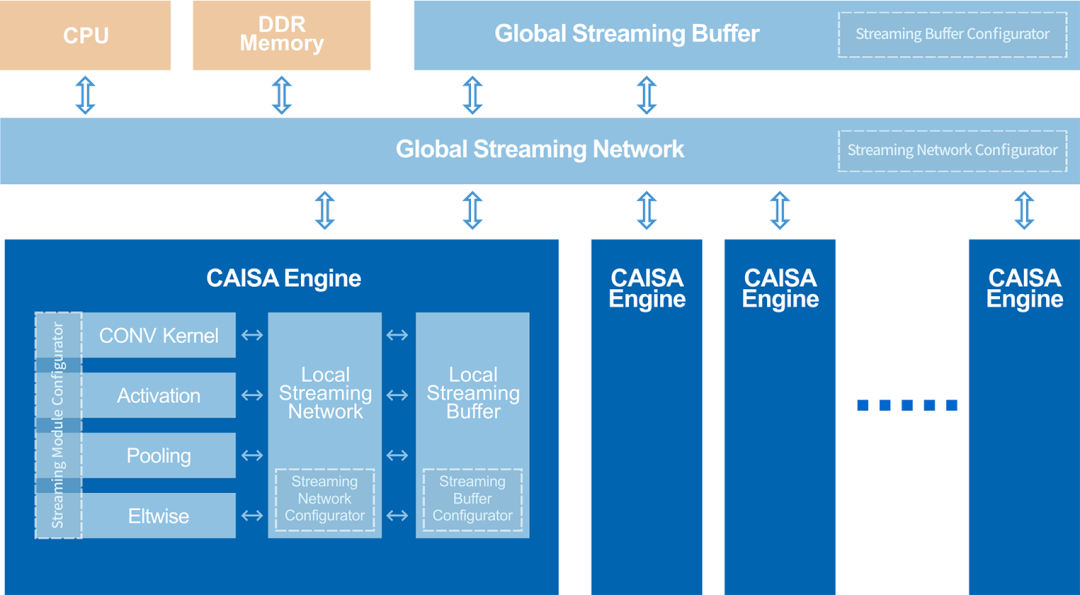 CAISA3.0架构图CAISA3.0架构继续保持在数据流技术路线的全球领先地位,指令集架构采用冯诺依曼计算方式,通过指令执行次序控制计算顺序,并通过分离数据搬运与数据计算提供计算通用性。CAISA架构依托数据流流动次序控制计算次序,采用计算流和数据流重叠运行方式消除空闲计算单元,并采用动态配置方式保证对于人工智能算法的通用支持,突破指令集技术对于芯片算力的限制。此次升级,CAISA架构解决了数据流架构作为人工智能计算平台的三大核心挑战:1. 高算力性价比:在保持计算正确前提下,通过不断压缩每个空闲时钟推高芯片实测性能以接近芯片物理极限,让芯片内的每个时钟、每个计算单元都在执行有效计算;2. 高架构通用性:在保证每个算法在CAISA上运行能够实现高芯片利用率的同时,CAISA3.0架构通用支持所有主流CNN算法;3. 高软件易用性:通过专为CAISA定制的编译工具链实现算法端到端自动部署,用户无需底层数据流架构背景知识,简单两步即可实现算法迁移和部署,降低使用门槛。具体来讲,鲲云CAISA3.0架构的三大技术突破主要通过以下的技术方式实现:1. 高算力性价比:时钟级准确的计算CAISA3.0架构由数据流来驱动计算过程,无指令操作,可以实现时钟级准确的计算,最大限度的减少硬件计算资源的空闲时间。CAISA3.0架构通过数据计算与数据流动的重叠,压缩计算资源的每一个空闲时钟;通过算力资源的动态平衡,消除流水线的性能瓶颈;通过数据流的时空映射,最大化复用芯片内的数据流带宽,减少对外部存储带宽的需求。上述设计使CNN算法的计算数据在CAISA3.0内可以实现不间断的持续运算,最高可实现95.4%的芯片利用率,在同等峰值算力条件下,可获得相对于GPU 3倍以上的实测算力,从而为用户提供更高的算力性价比。2. 高架构通用性:流水线动态重组CAISA3.0架构可以通过流水线动态重组实现对不同深度学习算法的高性能支持。通过CAISA架构层的数据流引擎、全局数据流网、全局数据流缓存,以及数据流引擎内部的人工智能算子模块、局部数据流网、局部数据流缓存的分层设计,在数据流配置器控制下,CAISA架构中的数据流连接关系和运行状态都可以被自动化动态配置,从而生成面向不同AI算法的高性能定制化流水线。在保证高性能的前提下,支持用户使用基于CAISA3.0架构的计算平台实现如目标检测、分类及语义分割等广泛的人工智能算法应用。3. 高软件易用性:算法端到端自动化部署