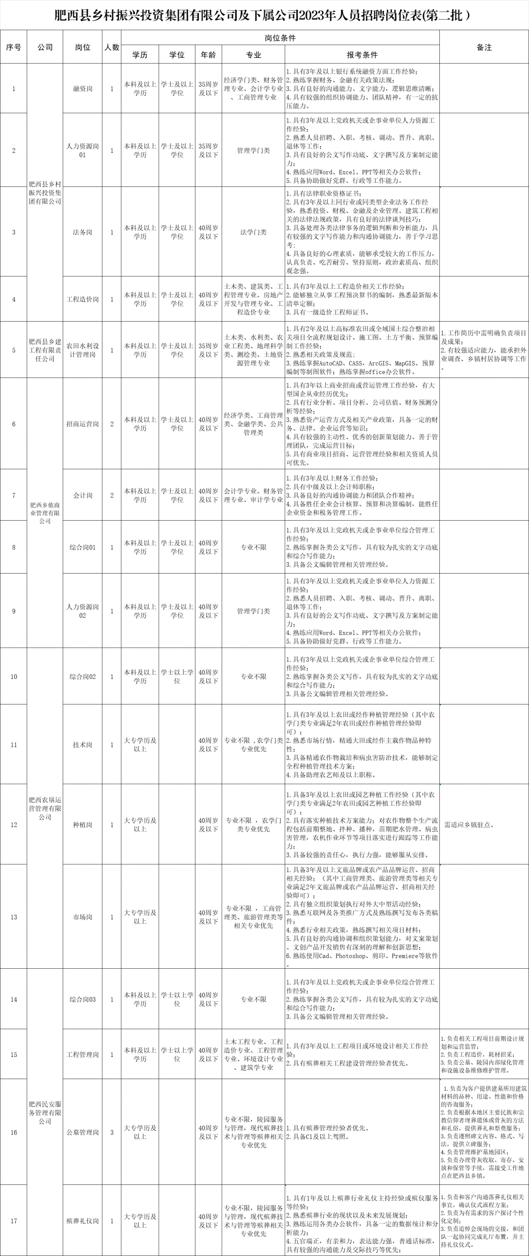 04肥西县乡村振兴投资集团有限公司招聘肥西县乡村振兴投资集团有限公司(下称“肥西乡投”)是经肥西县委、县政府批准成立的县属国有独资企业,定位为全县乡村振兴项目实施平台、全县乡村振兴项目投资主体、全县乡村振兴人才培训基地。根据肥西乡投发展需要,现公开招聘工作人员21名。