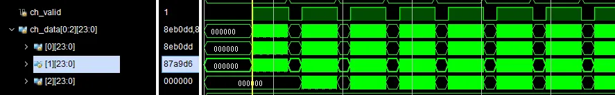 reg [10:0] out_data_cnt; reg [9:0] out_line_cnt; reg ch_valid; reg [23:0] ch_data [0:N-1]; always@(posedge clk or posedge reset) begin if(reset) begin for(j=0;j<3;j=j+1) ch_data[j] <= 0; end else if(valid[N-2]) begin ch_data[1] <= data[1]; if(out_line_cnt == 0) begin ch_data[2] <= 0; ch_data[0] <= data[0]; end else if(out_line_cnt == img_height -1) begin ch_data[2] <= data[2]; ch_data[0] <= 0; end else begin ch_data[2] <= data[2]; ch_data[0] <= data[0]; end end end always@(posedge clk or posedge reset) begin if(reset) begin ch_valid <= 0; out_data_cnt <= 0; out_line_cnt <= 0; end else begin ch_valid <= valid[N-2]; out_data_cnt <= valid[N-2] ? ((out_data_cnt == img_width - 1) ? 0 : out_data_cnt + 1) : out_data_cnt; out_line_cnt <= valid[N-2]&&(out_data_cnt == img_width - 1) ? ((out_line_cnt == img_height - 1) ? 0 : out_line_cnt + 1) : out_line_cnt; end end