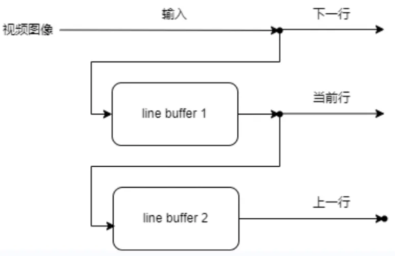 这样当新的一行数据到来时,第1个行缓存刚好输出上一行数据,第2个行缓存输出当前行数据,刚到来的新的一行数据直接当做下一行数据输出即可。
