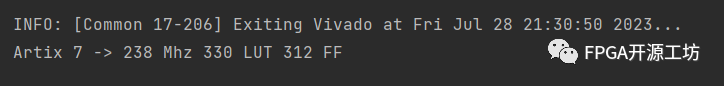 import spinal.lib._import spinal.core._import spinal.core.sim._import scala.collection.mutable.Queueimport java.io.FileOutputStreamimport scala.io.Sourceclass tbSobelC(th: Int) extends Sobel(th, 430, 430) { var src = Array[String]() var destDut = Array[String]() var destRef = Array[String]() // var srcLen = 0 var width = Array[Int]() var high = Array[Int]() val dutData = Queue[Int]() val refData = Queue[Int]() var frameLen = 0 def init(srcFile: Array[String], destDutFile: Array[String], destRefFile: Array[String], imgShape: Array[(Int, Int)]) = { clockDomain.forkStimulus(10) io.dataIn.data(0) #= 0 io.dataIn.row #= 0 io.dataIn.col #= 0 src = srcFile destDut = destDutFile destRef = destRefFile io.dataIn.c.de #= false io.dataIn.c.vsync #= false io.dataIn.c.hsync #= false frameLen = src.length width = imgShape.map(i => i._1) high = imgShape.map(i => i._2) clockDomain.waitSampling(10) } def frame(src: String, width: Int, high: Int) = { val srcFile = Source.fromFile(src) val srcData = srcFile.getLines() var colCnt = 0 var rowCnt = 0 io.dataIn.row #= width io.dataIn.col #= high io.dataIn.c.de #= false io.dataIn.c.vsync #= false io.dataIn.c.hsync #= false clockDomain.waitSampling(20) while (srcData.hasNext) { val data = srcData.next() io.dataIn.data(0) #= data.toInt io.dataIn.c.de #= true if (colCnt == 0 && rowCnt == 0) { io.dataIn.c.vsync #= true println("xx") } else { io.dataIn.c.vsync #= false } if (colCnt == width - 1 && rowCnt == high - 1) { clockDomain.waitSampling(1) io.dataIn.c.de #= false clockDomain.waitSampling(200) } if (colCnt == 0) { io.dataIn.c.hsync #= true } else { io.dataIn.c.hsync #= false } if (colCnt == width - 1 && rowCnt != high - 1) { clockDomain.waitSampling(1) io.dataIn.c.de #= false clockDomain.waitSampling(20) } if (colCnt == width - 1) { colCnt = 0 if (rowCnt == high - 1) { rowCnt = 0 } else { rowCnt = rowCnt + 1 } } else { colCnt = colCnt + 1 } clockDomain.waitSampling() } clockDomain.waitSampling(1000) srcFile.close() } def driver = { val dri = fork { for (i <- 0 until frameLen) { println(s"frame = ${i}") frame(src(i), width(i), high(i)) } } } def dutOut = { val dutOutFile = new FileOutputStream(destDut(0)) val d = fork { while (true) { if (io.dataOut.c.de.toBoolean) { dutData.enqueue(io.dataOut.data(0).toInt) dutOutFile.write((io.dataOut.data(0).toInt.toString + "\n").getBytes()) } clockDomain.waitSampling() } } } def refFun = { val d = fork { while (true) { for (i <- 0 until frameLen) { val file = Source.fromFile(destRef(i)) val srcData = file.getLines() while (srcData.hasNext) { clockDomain.waitSampling() val data = srcData.next().toInt refData.enqueue(data) } } } } } def scoreBoard = { val d = fork { var index = 0 while (true) { while (dutData.nonEmpty && refData.nonEmpty) { clockDomain.waitSampling() val dut = dutData.dequeue() val ref = refData.dequeue() // if(dut != ref){ // println(s"i:${index} dutData:${dut} refData:${ref}") // } index = index + 1 assert(scala.math.abs(ref - dut) < 5, s"index:${index}, dutData:${dut} refData:${ref}") // if (scala.math.abs(ref - dut) != 0) { // println(s"ref = ${ref} , dut = ${dut}") // } } clockDomain.waitSampling() } } } def waitSimDone = { val d = fork { var index = 0 while (index < width(0) * high(0)) { clockDomain.waitSampling() if (io.dataOut.c.de.toBoolean) { index = index + 1 } } clockDomain.waitSampling(3000) simSuccess() }.join() }}class tbSobel { val testFile = Array("testGray.txt") val dutFile = Array("testDut.txt") val refFile = Array("testSobel.txt") val imgShape = Array((430, 430)) val dut = SimConfig.withConfig(SpinalConfig(inlineRom = true)).withWave.compile(new tbSobelC(100)) dut.doSim { dut => dut.init(testFile, dutFile, refFile, imgShape) dut.driver dut.refFun dut.dutOut dut.scoreBoard dut.waitSimDone }}object tbSobel extends App { val tb = new tbSobel}经过分析之后,该代码可以跑到238MHz,占用330LUT,312FF。
