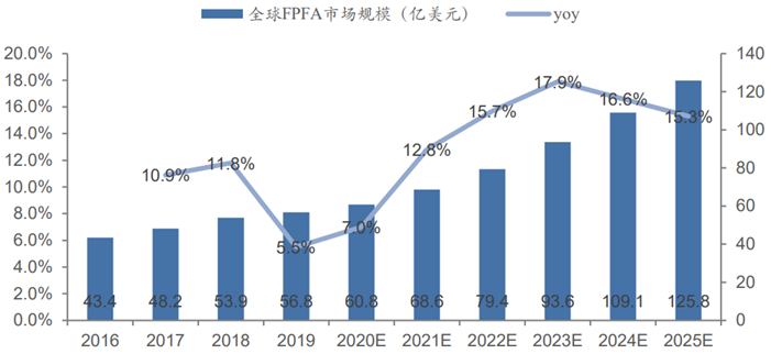 FPGA下游应用市场广泛,随着5G技术的提升、AI的推进以及汽车自动化趋势的演进,全球FPGA市场规模将稳步增长。Frost&Sullivan,预计全球 FPGA需求将从2021年 68.6 亿美元增长为2025年125.8亿美元,年均复合增长率约为 16.4%。