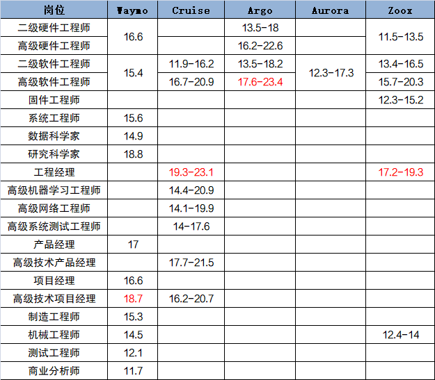 近年来,由于前员工离职而引发的窃取商业机密诉讼(以Anthony Levandowski为代表),在自动驾驶汽车领域频频发生,引起了业内的关注和重视。在这些纠纷的背后,是自动驾驶人才的紧俏和稀缺。整车企业、互联网公司、科技巨头,纷纷加入了抢夺优秀自动驾驶人才的大军,为吸引精英加盟,他们给出了让人无法拒绝的高薪酬和优厚福利。前不久,外媒公布了Argo AI、Aurora、Cruise、Waymo和Zoox五家自动驾驶公司各研发职位的年薪资水平,约为11.5万(约合人民币80.5万元)至23.4万美元(约合人民币163.8万元)之间,折合人民币月薪6.7万至13.6万元。此外,据知情人士透露,这些公司提交的薪资中不包含奖金和股票奖励,也就是说,这只是五家自动驾驶工程师工资的“起步价”。