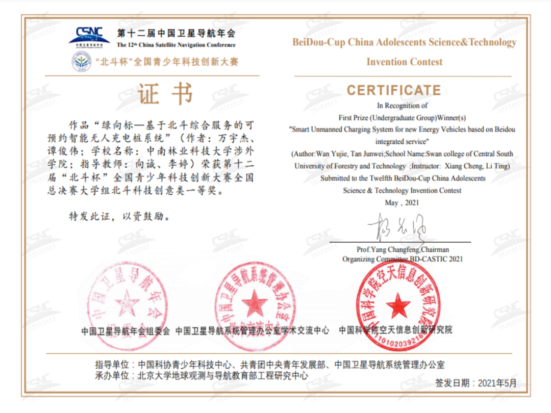 学生参加“北斗杯”全国青少年科技创新大赛全国总决赛获一等奖。