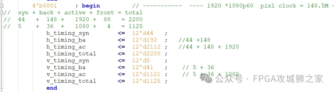那么依照这个视频流可以在FPGA中产生标准时序,首先将这些参数添加进去,看注释中数据,就知道怎么填了。这样任意的分辨率都可以产生了。
