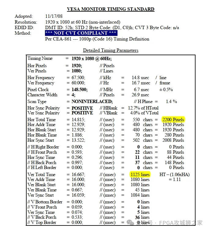 里面规定了VESA视频流同步信号的时序,以1080p为例可以查询到具体情况如下图