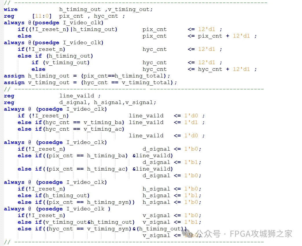 然后利用这个参数产生同步信号,自此任意同步信号产品器就完成了。有人会说,这个东西,不就是xilinx官方的IP VTC 嘛,干嘛要重复造轮子。嘿嘿,那是因为,一,我们在做图像处理的时候要尽量的避免使用vivado这个仿真器,因为它实在是太墨迹了。二,如果是1080p以上的分辨率,比如4k,8k,的视频流,它在FPGA里面是双点,四点模式的,VTC没有这个功能,这个就要靠自己去实现了。