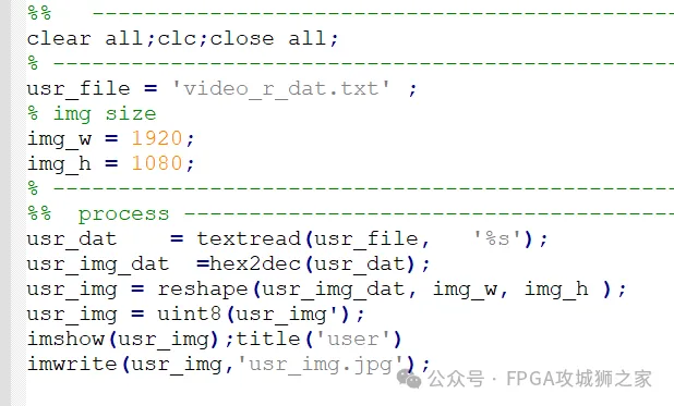 当我们拿到了modelsim里面的仿真视频流一帧的文件txt,直接读入到matlab里面去就好了。几行代码就完成了华丽的转换。