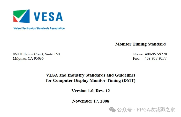 VESA 视频标准同步信号产生器,是从事FPGA图像领域工程师经常使用到的模块。首先,它的标准时序来自 VESA 视频标准文件。