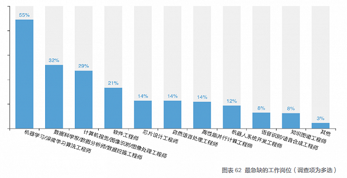 报告指出,在人工智能领域,软件工程师最热门,机器学习/深度学习算法工程师最为稀缺。数据显示,有 55% 的开发者表示团队急需机器学习/深度学习算法工程师;其次是数据分析师和图像处理工程师。