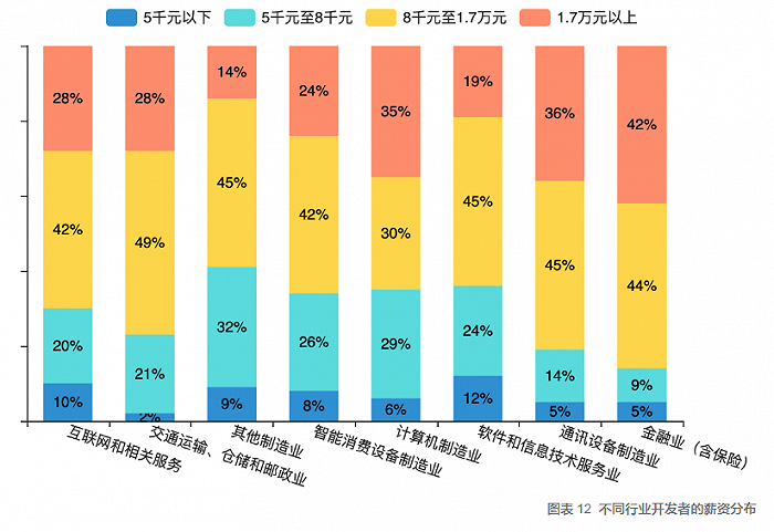 界面职场发现,虽然互联网行业在外界被认为薪资待遇优渥,但是报告显示,金融行业的开发者高收入人群比例最高,86%的人群月薪超过8千元,其中42%的开发者月薪在1.7万元以上。其次是通讯设备制造行业,也有八成人群的月薪高于8千元,而互联网行业的开发者不到三成的月薪能高于1.7万元。
