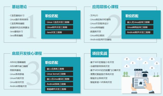 华清远见把该课程分为三个阶段,其一为嵌入式系统开发基础理论阶段;其二为嵌入式系统开发核心;其三为嵌入式开发拓展与实践。全面以企业人才需求为导向,科学的课程安排,让学员在 4个半月的时间里,由浅入深地对嵌入式Linux和Android系统进行全面学习,能够独立胜任嵌入式Linux和Android两个方向的开发工作。