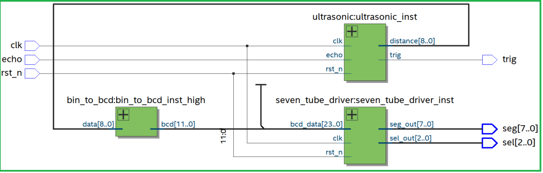 代码分为3个大的模块,超声波测距模块、二进制转BCD模块、数码管驱动模块