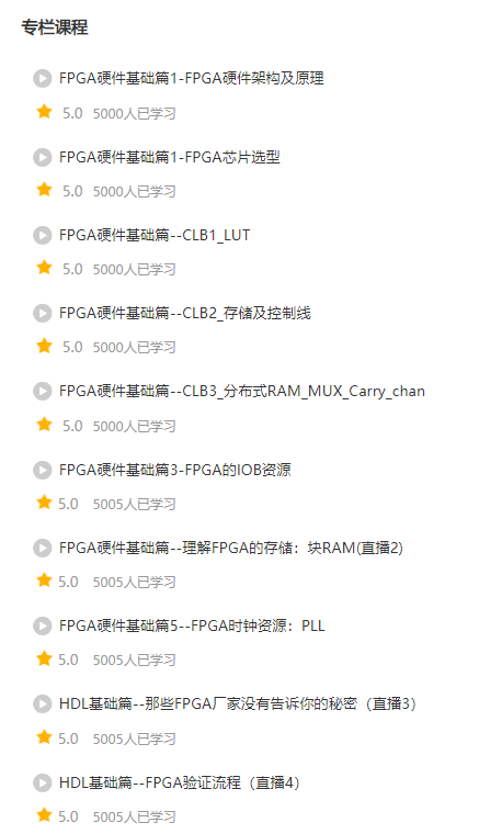 从零入门系列课共分为五大部分,分别是:硬件基础、HDL基础篇、入门基础篇、仿真基础篇、静态时序篇。每个视频针对性地讲一个小点,条理清楚,逻辑清晰,由浅入深,循序渐进,非常适合新手入门。这套视频不像其他有些视频一样很冗长,让人一看到视频的时长就望而却步,视频教程最长不超过两个小时 ,最短也就二十多分钟,让人看着不会觉得很枯燥。日常刷一个小视频的时间而已,而且还能学会很多东西,何乐而不为呢?