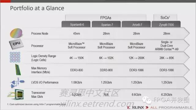 赛灵思(Xilinx)现在拥有的成本优化型All Programmable产品组合由四大系列组成:用于I/O优化的Spartan-6 FPGA,用于I/O优化并具备最高单位功耗性能的Spartan-7 FPGA,用于实现收发器优化和拥有最高DSP带宽的Artix-7 FPGA,以及用于系统优化(可扩展处理器集成)的Zynq-7000 All Programmable SoC (基于Artix-7架构)。