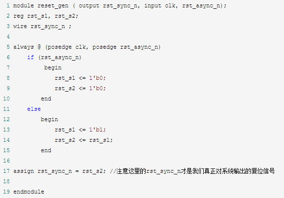 异步复位同步释放:也就是先做一个异步复位电路,当复位信号来临时立马复位,输出经过同步器同步到不同时钟域输出,扇出大的情况下加max fanout约束。前面的异步复位可以解决同步复位时时钟边沿在复位信号边沿附近时出现的亚稳态,而输出时由于是同步器打拍,又避免了异步释放时,时钟和复位信号边沿接近时的亚稳态传播,同时保证复位信号和时钟边沿对齐。下图为例子代码。