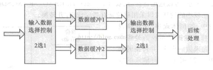 如下图,左边输入数据率假设是N bit/s,经过选择器后分流,缓冲器1和2的速率就只有N/2 bit/s,输出依然是N bit/s。输入输出速率不变,但是在缓冲器里的处理速率降低为原来的1/2,可以为某些复杂操作节省很多时间。处理主频降低,但是消耗资源增加,这就是面积互换原则的体现。