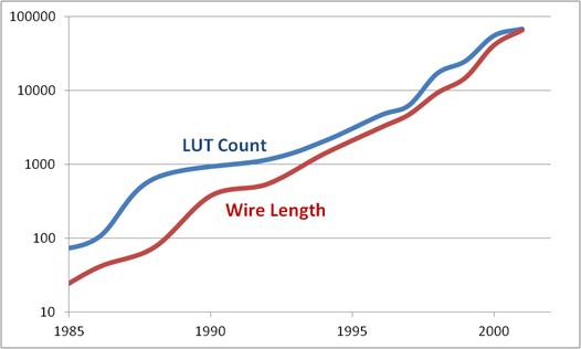 图 2:FPGA LUT 和互连线路的增加。线路长度以数百万晶体管间距来测量。