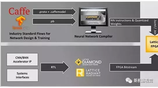 开发人员单独将通过Caffe或TensorFlow开发并训练好的模型导入SensAI平台。这里,Lattice神经网络编译器将训练好的Caffe或TensorFlow模型转换为一组包含神经网络模型参数和执行命令序列的文件。SensAI平台将来自设计环境和编译器的单独输出一起并入FPGA,以提供最终的推理模型(图5)。
