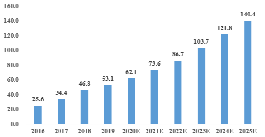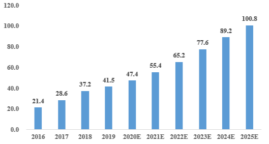 FPGA芯片目前被大量应用在无线通信和有限通信设备中,实现接口扩展、逻辑控制、数据处理、单芯片系统等各种功能。在有线通信领域,FPGA芯片被应用于数据接入、传送、路由器、交换机的多种电路板中,以实现信号控制、传输加速等各种功能。在无线通信领域,FPGA芯片被应用在无线通信基站和射频处理单元的多种电路板中以实现通信协议的各种功能和未来升级需求,集成CPU的现场可编程系统级芯片产品被应用在室外微基站、室内微基站等无线网络通信中,以单芯片完成商业、住宅、工厂区域的多模覆盖、网络容量增加、人工智能计算等多样性功能需求。在网络通信领域,FPGA芯片得到大规模运用主要是由于其具有高度的灵活性、极强的实时处理和并行处理能力,大大加强了通信设备的处理能力。(2)工业领域工业领域是FPGA芯片的主要应用市场之一,Frost&Sullivan数据显示2020年应用于该领域的FPGA芯片中国销售额将达到47.4亿元,占中国FPGA芯片市场份额的31.5%,2021年至2025年年复合增长率将达16.1%。图:中国FPGA工业领域市场规模及预测
