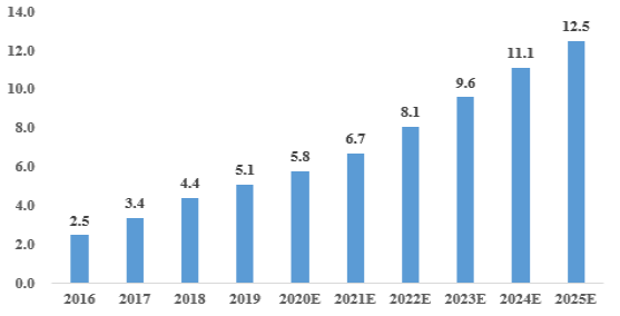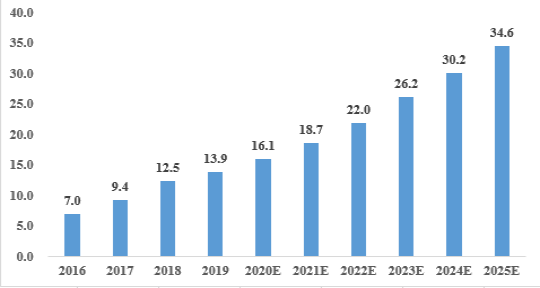在汽车智能化发展的趋势下,FPGA可用于控制和驱动电动汽车电机控制系统,连接驾驶系统、仪表盘、雷达、超声波传感器等各种车载设备,实现激光雷达、毫米波雷达等信号处理和控制。在视频桥接和融合领域,FPGA可用于实现多个图像传感器的信号桥接、3D环视视频融合、倒车辅助视频、辅助驾驶视频等功能。在辅助驾驶和自动驾驶领域,FPGA可用于实现机器视觉与目标检测等各种功能。相比较其他通用芯片方案,FPGA在辅助驾驶的视频分析功能中可采用超低延时精确算法对来自车辆摄像机的实时视频输入信号进行分析,及时做出判断,并且FOGA可以在不进行重新设计的前提下实现重新编程,以适应不断发展的算法,从而缩短整体方案的开发周期。(5)人工智能Frost&Sullivan数据显示2020年应用于该领域的FPGA芯片中国销售额将达到5.8亿元,2021年至2025年年复合增长率将达16.9%。图:中国FPGA人工智能市场规模及预测