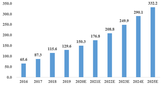 FPGA又被成为“万能芯片“,可以应用于多个行业中,根据Frost&Sullivan数据,中国FPGA市场2020年的市场规模约150.3亿元,预计2025年中国FPGA市场规模将达到332.2亿元,复合增速为17.2%。