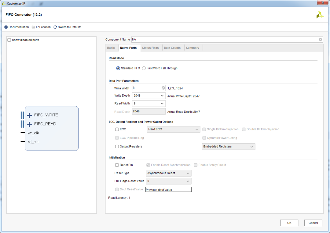 我们使用异步FIFO,深度选择2048,位宽为8,复位信号暂时不使用。