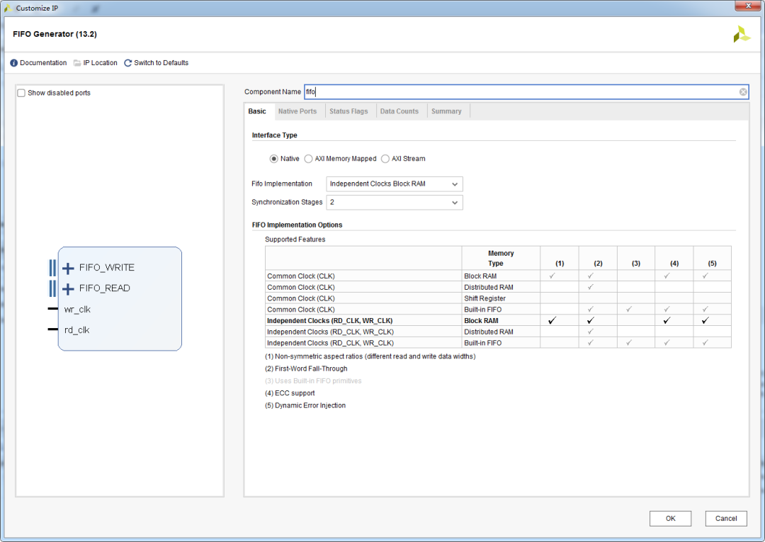 在做完两个模块之后,我们还需要使用一个FIFO来做数据缓存,FIFO配置参数如下: