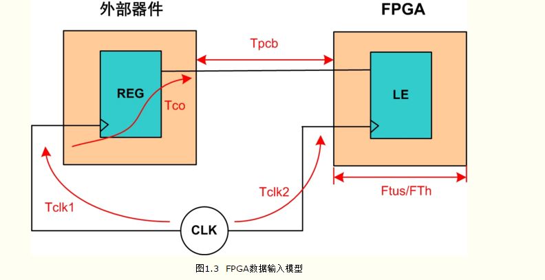 在FPGA的设计中除了应该考虑到输入输出接口的时序,还应该考虑到内部寄存器到寄存器的时序问题。内部寄存器之间同样要满足建立和保持时间要求,如上图所示