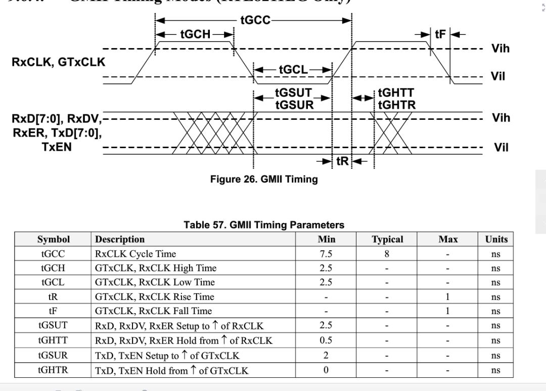若系统外部PHY芯片的型号是RTL8211EG,其芯片手册中给出了PHY接口处的时序,如图所示: