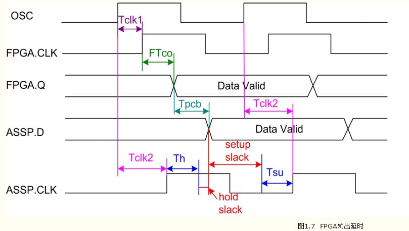 T: 系统时钟频率c. 输出延时即为FPGA输出数据后到达外部器件的延时时间。如1.7所示,为FPGA和外部器件接口时序图。