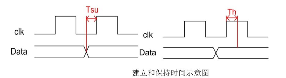 建立时间(Tsu):是指在时钟沿到来之前数据从不稳定到稳定所需的时间,如果建立的时间不满足要求,在时钟上升沿,寄存器将不能正确采到数据值。如下图(左)所示:
