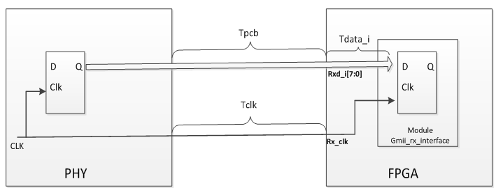 Tpcb是外部PCB板上数据的延时,Tdata_i是数据的输入延时,Gmii_rx_interface相当于Rxd进入FPGA后的第一个寄存器模块(可以专门写一个接口模块,将Rxd数据打一拍,用于接收数据)。如果Gmii_rx_interface距离接口Rxd较远,Tdata_i的路径较长,布局布线时Rxd的八根线时延相差可能就比较大,所以我们应让这个模块放在距离Rxd接口较近的地方。