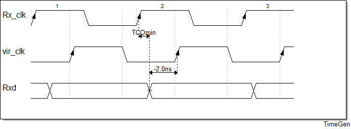根据下图所示,当Tco取1ns时,Rxd有效时相对于Rx_clk上升沿偏移1ns,相对于vir_clk上升沿偏移-2ns;当Tco取5ns时,Rxd有效时相对于Rx_clk上升沿偏移5ns,相对于vir_clk偏移2ns。