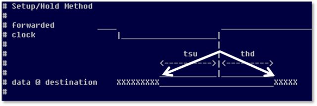 根据outputdelay中max/-min的定义,源同步接口中输出最大最小延时为输出时钟上升沿到达之前最大与最小的数据有效窗口。如图所示,用于建立时间分析的set output delay –max的值为正数2.5ns,表示数据窗口在Gtx_clk上升沿之前2.5ns时间内有效,而用于保持时间分析的 -min之后跟着负数-0.5ns,表示数据在Gtx_clk上升沿之后0.5ns内有效,即相对于Gtx_clk输出数据有效窗口为-0.5ns到2.5ns,这个范围大于等于PHY芯片手册中给出的Txd相对于Gtx_clk的窗口范围时,才能满足PHY芯片采集Txd时的时序要求。