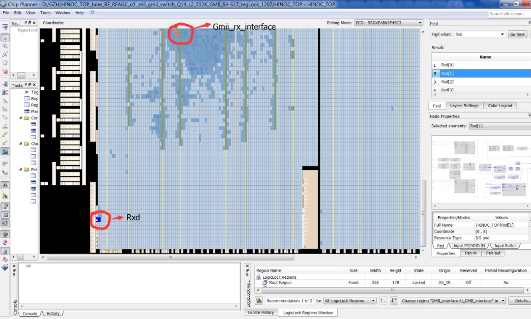 Quartus软件中有一个LogicLock(物理分区)功能,把Gmii_rx_interface模块建立成一个LogicLock分区但并不对分区位置和大小进行固定,然后重新编译工程。布局布线后就可以在chipplaner工具中看到这个分区的位置,如下图所示(放大可以看清),Gmii_rx_interface模块距离Rxd接口位置很远,布局布线时,输入信号要绕很长一段距离才会到达输入的寄存器,资源占用很多时,Rxd的8根数据线长度不一,很容易造成时序问题。