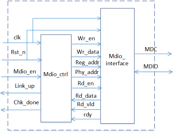Mdio_ctrl模块负责完成PHY芯片的配置与检测逻辑,Mdio接口模块完成读写操作时序。此处仅通过读操作简单检测PHY状态,暂不进行配置,故两模块工作状态跳转如图所示: