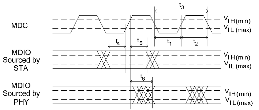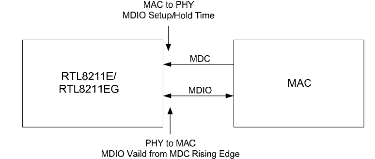 很明显MAC驱动总线时,在MDC下降沿更新数据。而PHY驱动总线时,MDC上升沿后更新数据。根据datasheet中的timing参数设定MDC时钟周期是800ns,MAC接收PHY数据时下降沿采样。
