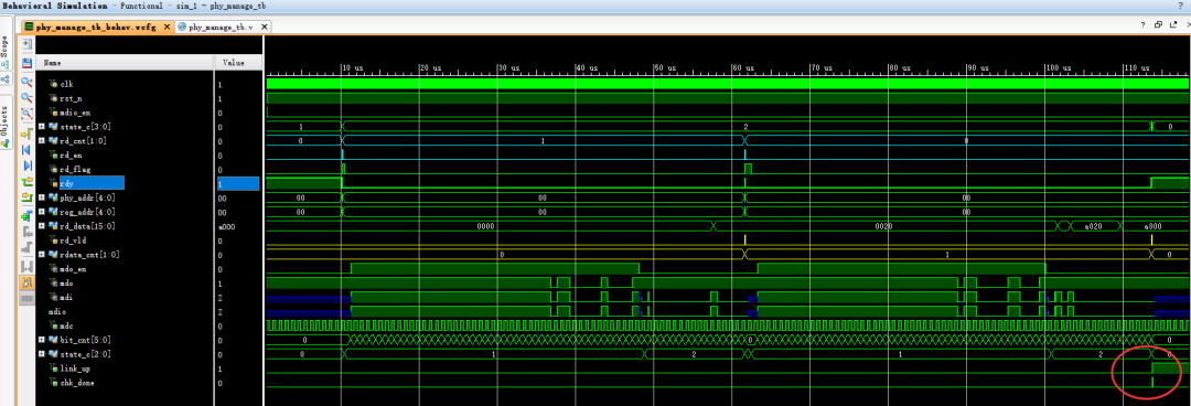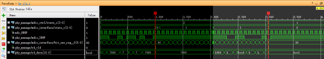 查看debug波形,MDIO时序接口模块在释放MDIO串行总线时,由于存在上拉电阻为高电平,下一个MDC时钟上升沿时刻,PHY拉低MDIO信号响应并得到总线控制权,开始输出数据。