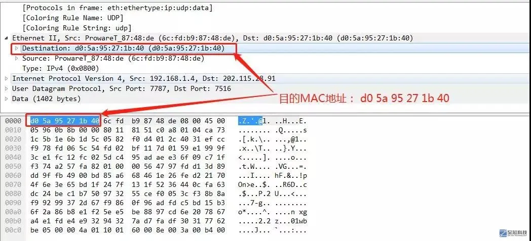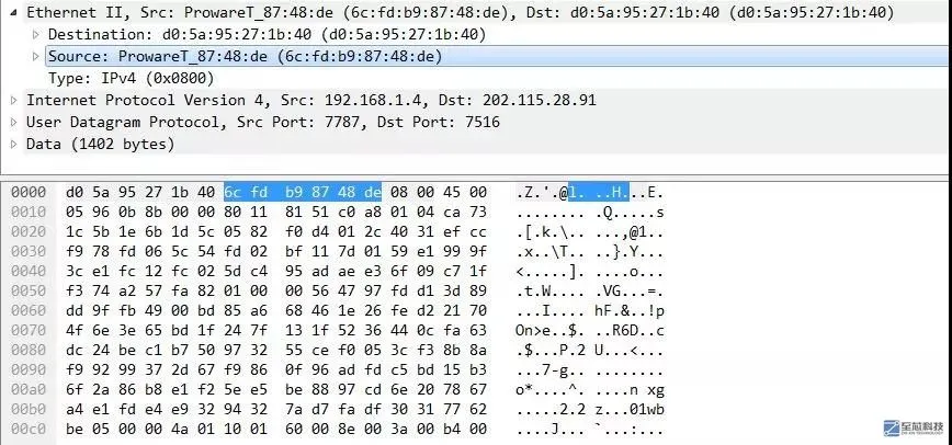 这样看,是不是就可以知道这个UDP包的前6个字节,就是目的MAC地址了呢?再来看接着的6个字节数据:6c fd b9 87 48 de