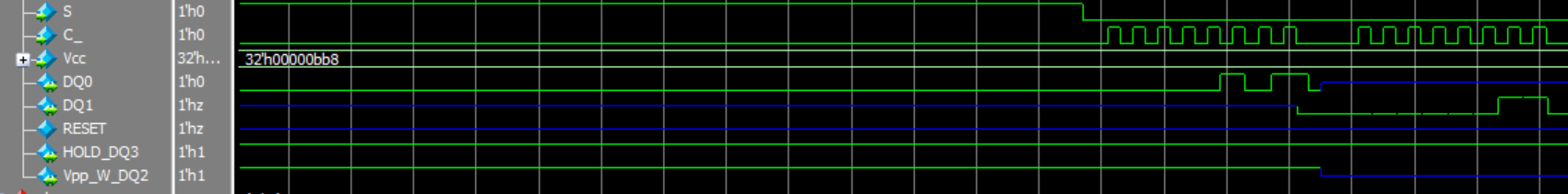 通过查阅芯片的用户手册,向FLASH芯片发送相关指令。DQ0信号为输入FLASH芯片信号,DQ1为FLASH芯片输出信号。