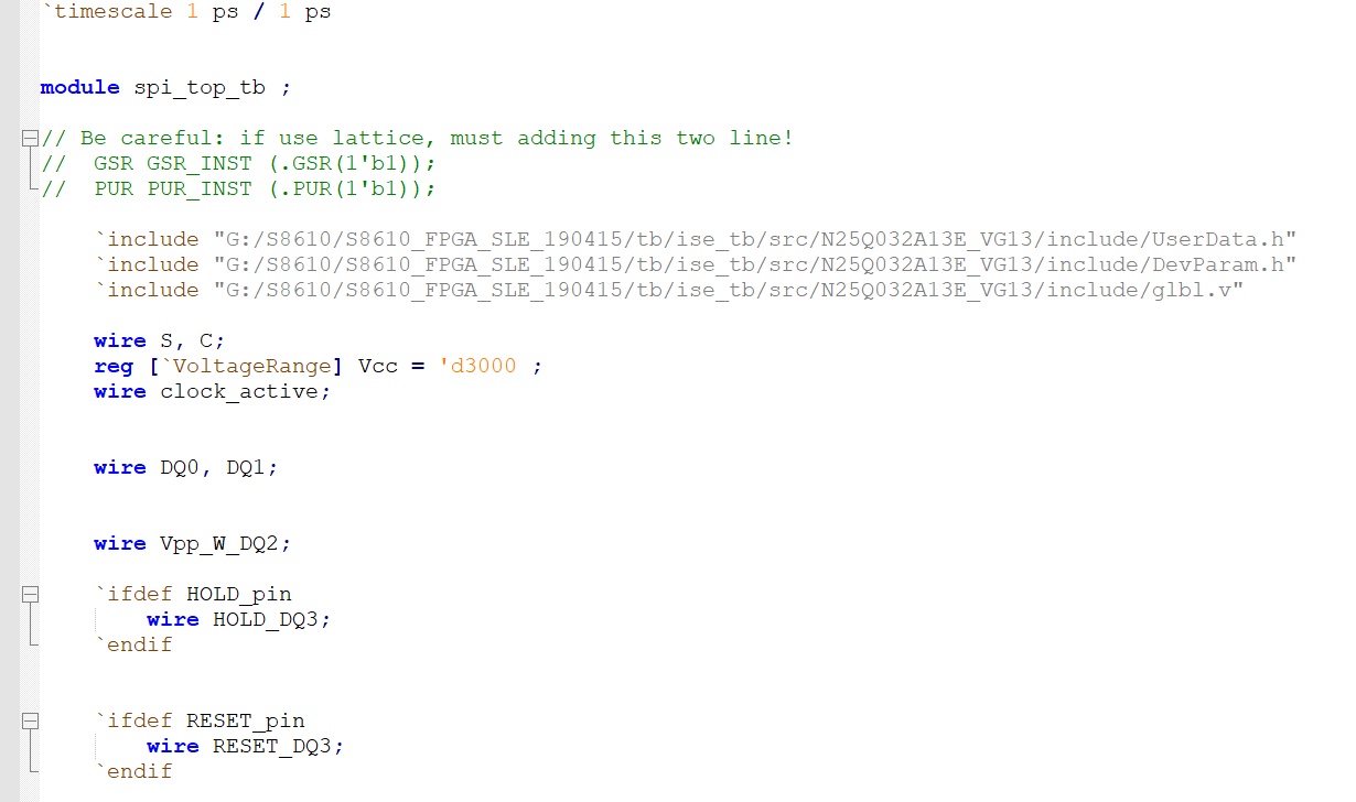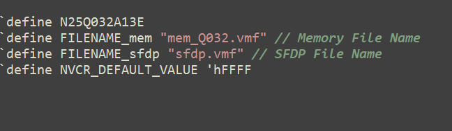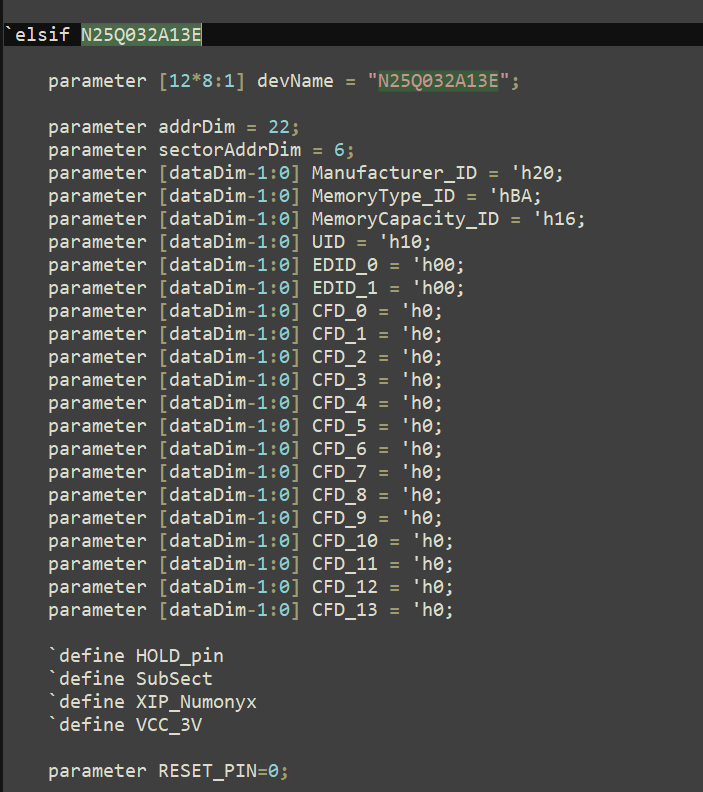 在DevParam.h文件中,包含了上述器件所有的器件端口以及属性定义,其中我所使用的N25Q032A13E器件的定义如图2.3所示,里面包含了仿真所需的端口定义以及相关信息,一般来说我们不需要修改,保持默认就好。