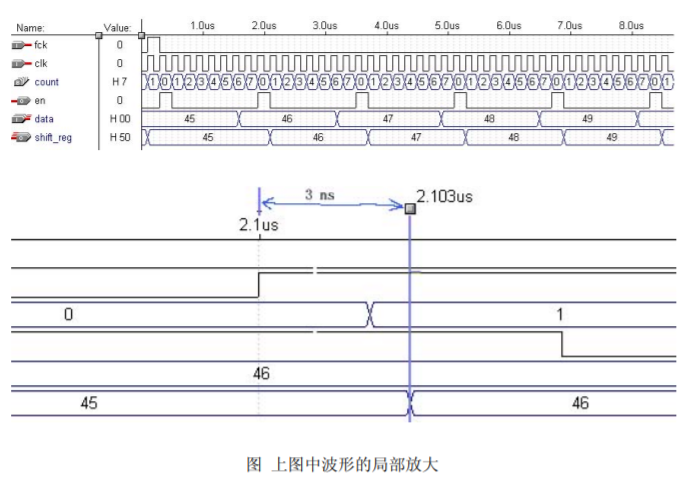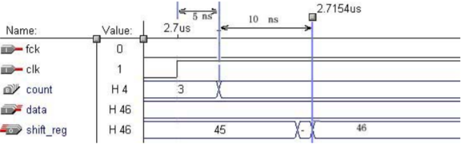 在上述的第一个 process 电路描述中,首先计数器的输出结果(count(2))相对于全局时钟 clk 已经产生了一定的延时(延时的大小取决于计数器的位数和所选择使用的器件工艺);而在第二个 process 中使用计数器的 bit2 作为时钟,那么 shift_reg 相对于全局clk 的延时将变得不好控制。布局布线器最终给出的时间分析也是不可靠的。这样产生的结果波形仿真如下图所示: