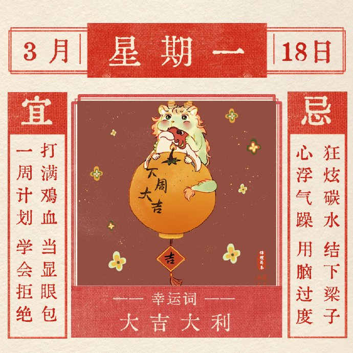 <!--WeiboOriginalContent[{"text": "📢明日周一,锦鲤宜忌播报:\n[嘻嘻]宜:一周计划 学会拒绝 打满鸡血 当显眼包\n
