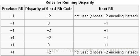 你们也许注意到了表中有个RD标志,它是Running Disparity的缩写,它的目的就是保持8B/10B编码中的直流平衡。它跟上面提到的Disparity其实是一样的意思,+1用来表示1比0多,-1用来表示0比1多,-1是它的初始化状态。下面我们来看一张表来加深理解:
