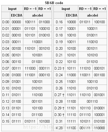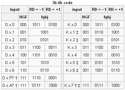 † 对于D.x.7,当和5B/6B组合时D.x.P7和D.x.A7编码必须选择一个来避免连续的5个0或1。遇上连续5个0或1的情况下使用“逗号码”来进行校准。D.x.A7用在x=17 x=18 x=20当RD=-1时,x=11 x=13 x=14 当RD=+1时。当x=23 x=27 x=29 x=30时,使用K.x.7进行编码。其他情况下x.A7码不能被使用,他将会导致和其他“逗号序列”产生冲突。