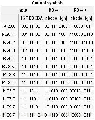 † 在控制代码中,K.28.1 K.28.5 K.28.7 是逗号序列,逗号序列是用来校准用的,如果K.28.7没有被使用,序列0011111 或者 1100000 是不会出现在任何编码中的。